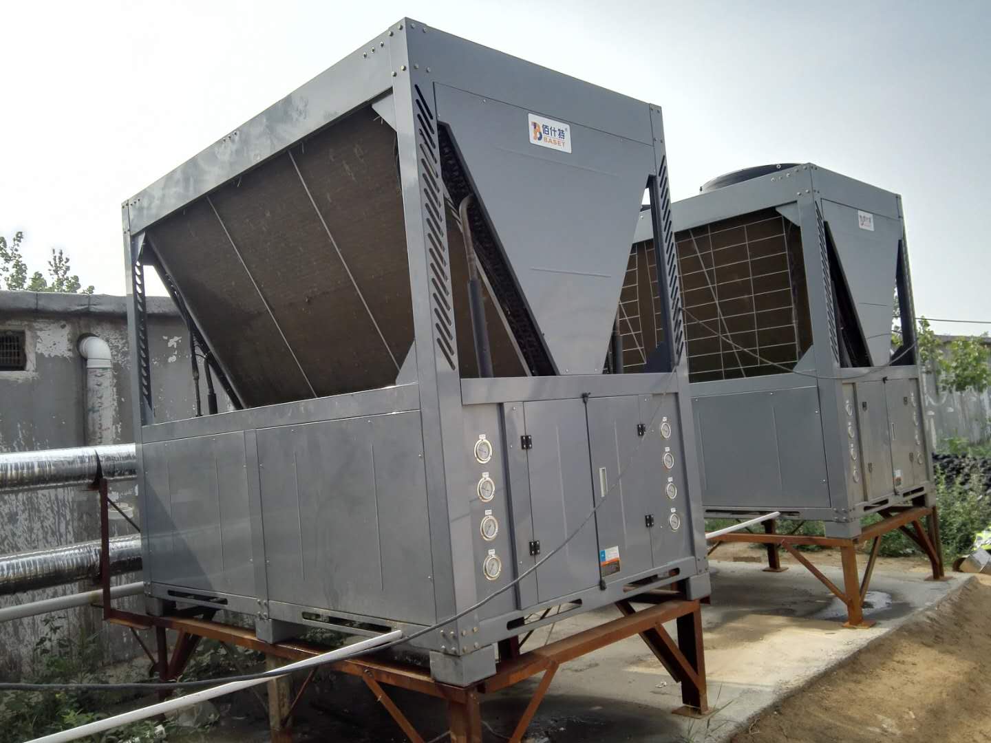 兩臺50匹超低溫風(fēng)冷冷熱水機組為河北省滄州市某孵雞場供暖,要求室溫保持在38℃~39℃。