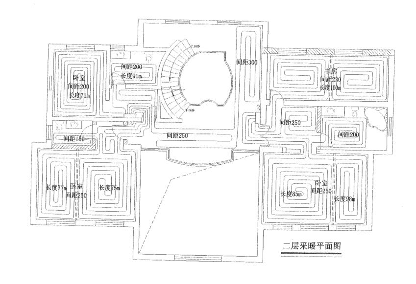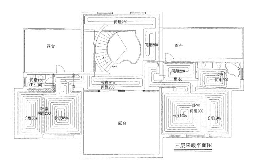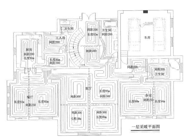 鑒于地暖墊層本身有較大的蓄熱能力,足以維持室內(nèi)的熱舒適性,可不設(shè)蓄能水箱,采用空氣源熱泵機(jī)組直供。各層地暖平面如圖。